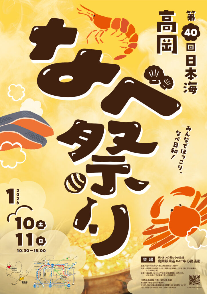 2026年(令和8年)1月10日(土)・11日(日)の2日間、高岡駅周辺及び中心商店街を会場に、第40回日本海高岡なべ祭りを開催します。